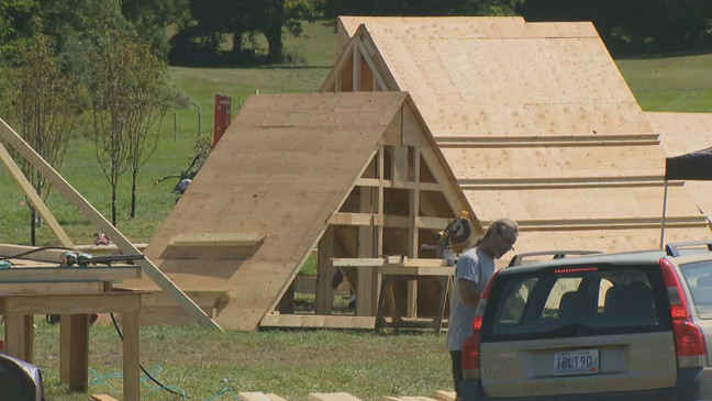 Crews are transforming Chase Farm Park in Lincoln into a 1600s-era movie set with eight structures, some two stories high.