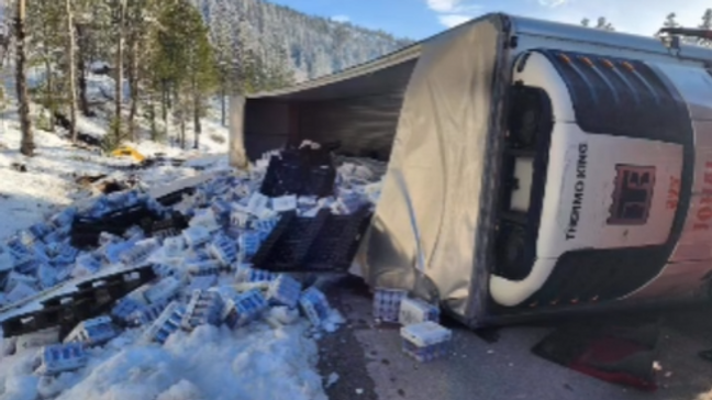 A semi-truck carrying cases of Coors Light beer overturned on I-80 in Placer County early Monday morning, scattering silver cans across the roadway, according to the California Highway Patrol.