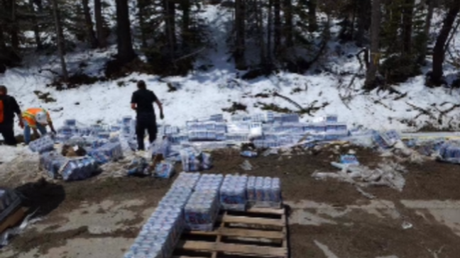 Mountains turn blue as Coors Light semi overturns, scattering cans across interstate