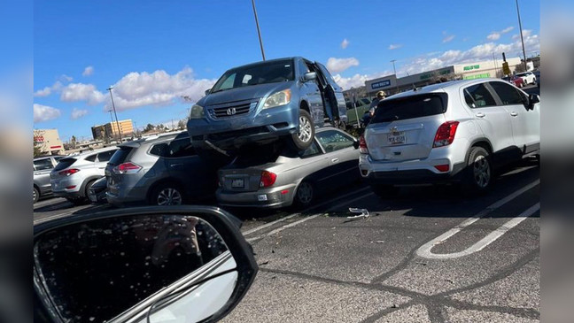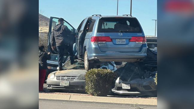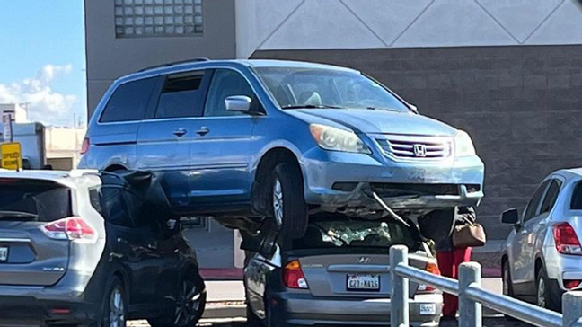 Somehow, a van landed atop two vehicles in a mall parking lot in El Paso, Texas.