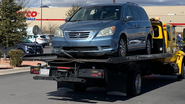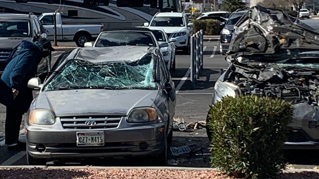 A van somehow landed atop 2 other vehicles at Bassett Place, a mall in El Paso, Jan. 18, 2023. (left: Gwenyth Adkins, right: Jonathan Rogelio Villanueva)